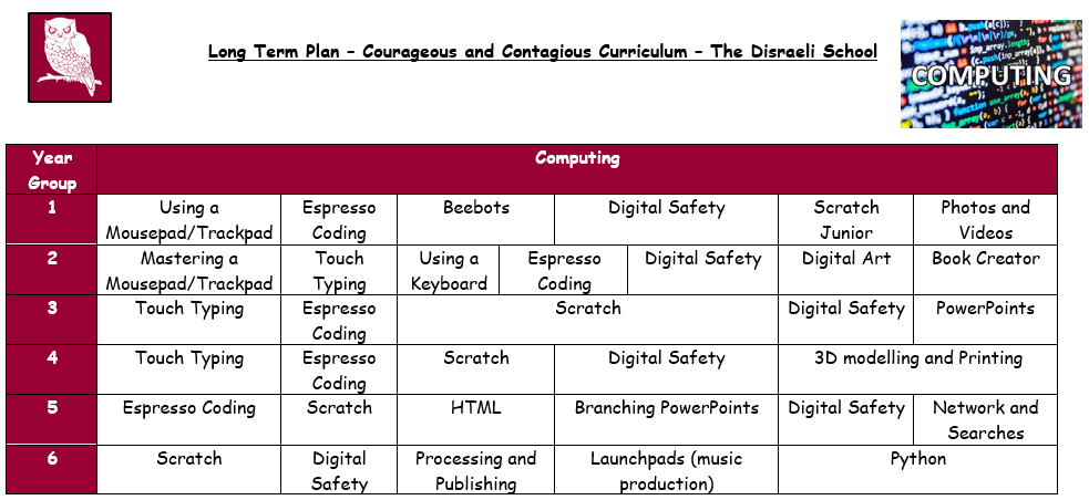 Children will leave the Disraeli School having covered all of the National Curriculum requirements in depth, and will therefore confidently use technology, from basic knowledge and skills such as the use of mousepads and keyboard, to complex programming knowledge and skills.